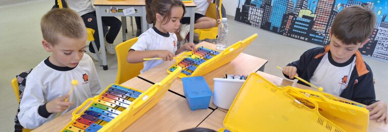 En primero de primaria la música se vive y se siente. En cada clase cantamos, nos movemos, tocamos instrumentos y descubrimos sonidos nuevos. ¡Aprendemos jugando! A veces usamos el xilófono, otras veces nuestro propio cuerpo para marcar el ritmo o acompañar canciones. Cada clase se convierte en una aventura llena de ritmo, risas y trabajo…